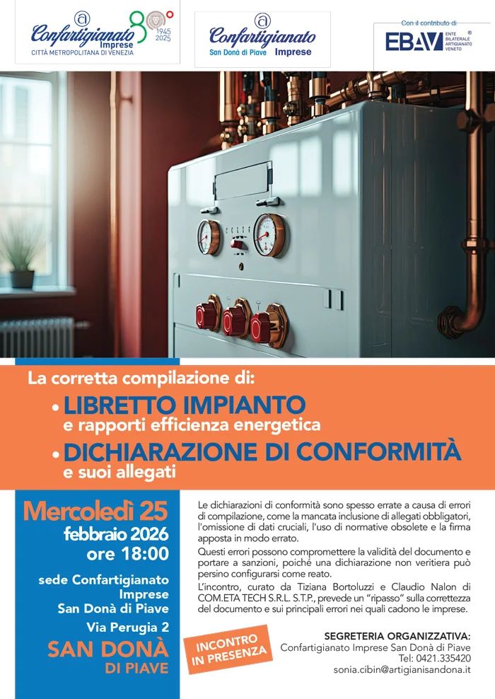 ARTIGIANI INSTALLATORI – Seminario informativo gratuito sulla corretta documentazione Libretto d’Impianto e DI.CO – mercoledì 25 febbraio 2026 ore 18.00