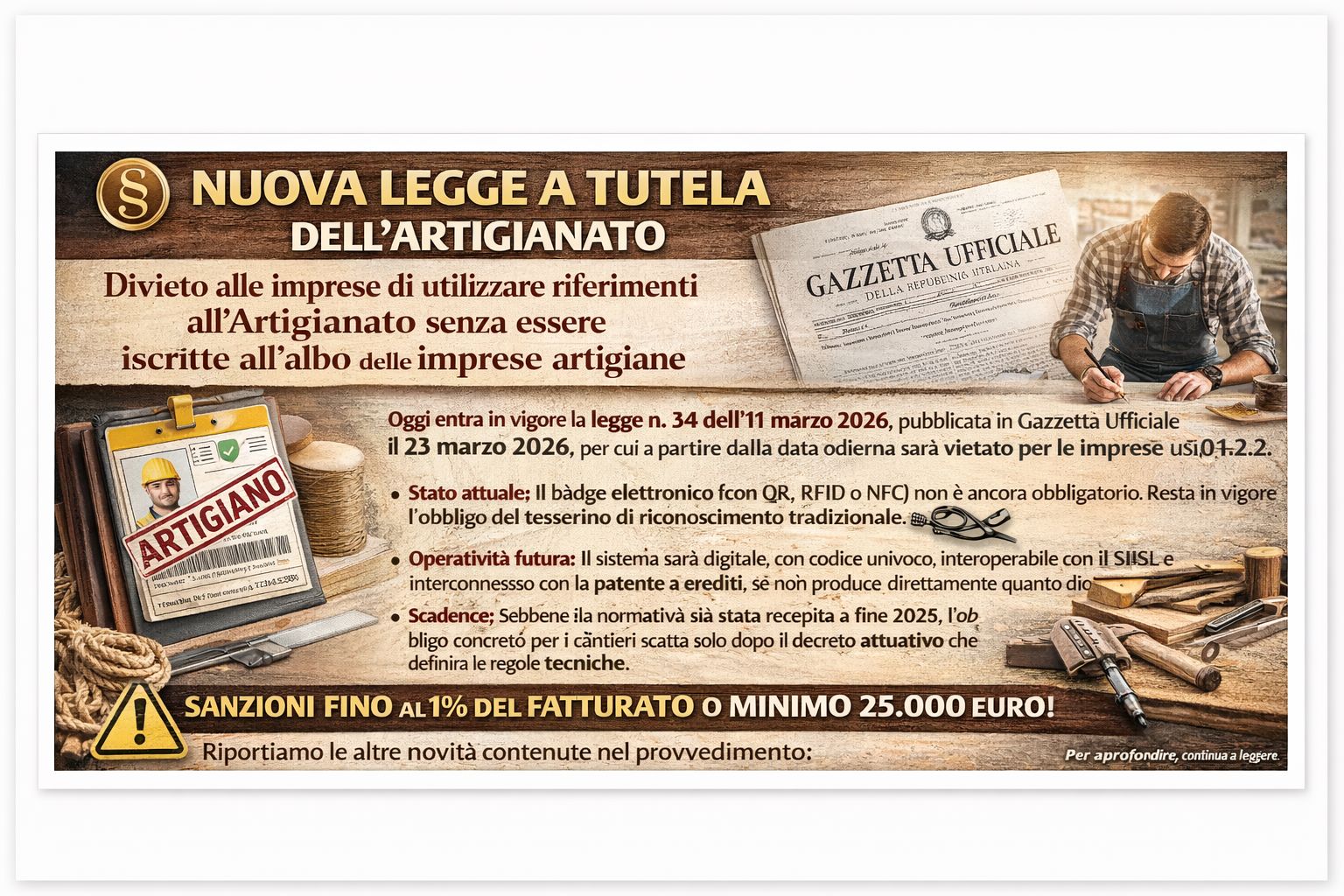 Oggi entra in vigore la legge n. 34 dell’11 marzo 2026, pubblicata in Gazzetta Ufficiale il 23 marzo 2026, per cui a partire dalla data odierna sarà vietato per le imprese utilizzare riferimenti all’artigianato senza essere regolarmente iscritte all’albo delle imprese artigiane.